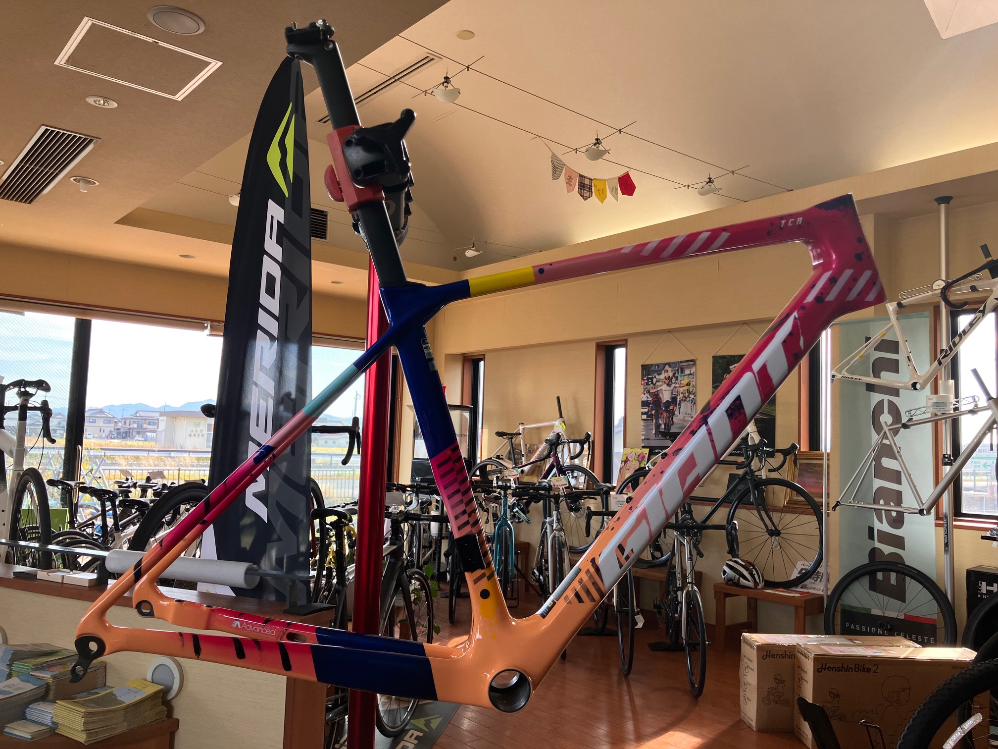 ジャイアントから今までにないデザインのフレームセットが入荷しました。今回ご用意できたのは、TCR ADVANCED PRO。セカンドグレードのフレームセットです。フル内装化に対応した設計で、よりスマートかつエアロな軽量オールラウンドモデルとなっています。2026年モデルの発表と同時に一目ぼれして店頭へ展示することに決めました。フレームデザイン自体が個性的なので、周りを固める部品のカラーは黒で統一すると締まった感じがして、カッコいいんじゃないかと思います。NEWバイクのフレームにいかがでしょうか。