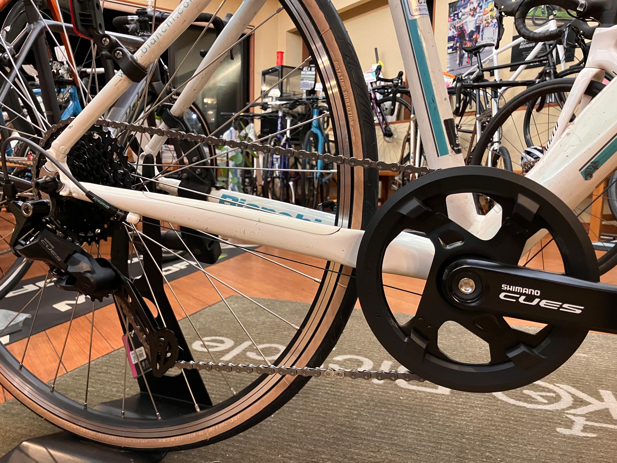 そこでご案内させていただいたのが、幅広い互換性を持つシマノのコンポーネント「CUES」です。現行品のためあらゆる部品が手に入ります。互換表とにらめっこしながらこのフレームに合い、目的と規格を満たす部品をセレクト。