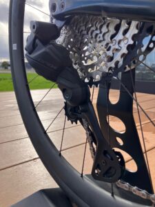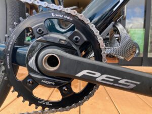 対応カセットスプロケットが12速の11-51Tのみや、フリーボディーがマイクロスプラインであることなど、ロードバイクに搭載するにはいくつか乗り越えないといけないハードルはありましたが、既存使用のSTIレバーとパワーメーターを活用しながら、フロントチェーンリングにはウルフトゥースの44Tを採用するなど工夫してお客様のご要望を具現化することができました。