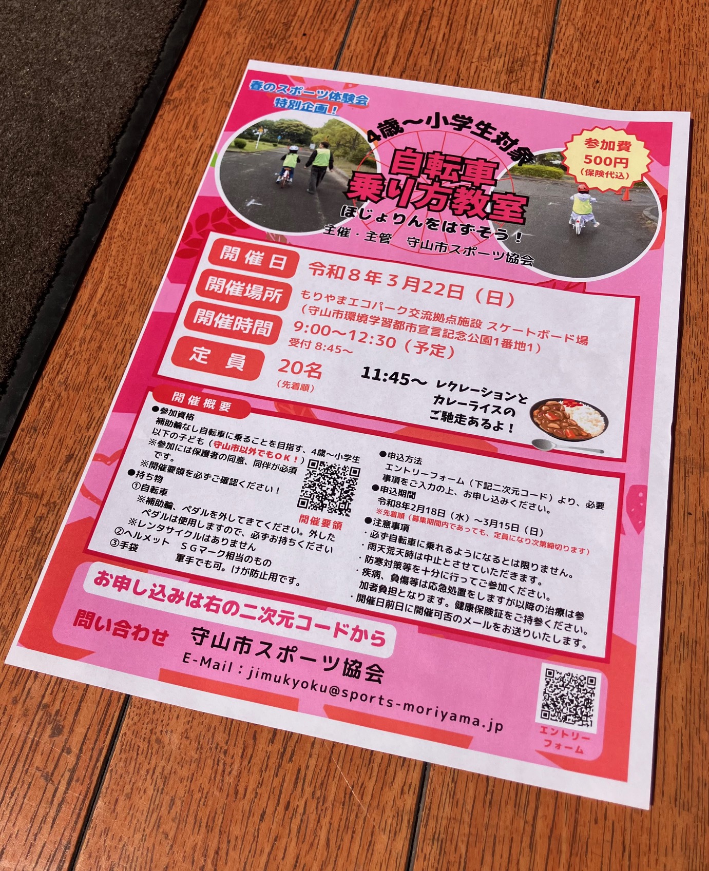 今回のお申し込みはすでに終了しておりますが、守山市スポーツ協会では、不定期で自転車乗り方教室を開催されています。既にお持ちの自転車で参加できることと、参加費がワンコインというところが、とてもフレンドリーですね。次回、開催の情報をいただいた時には、早目に情報UPするようにいたします。