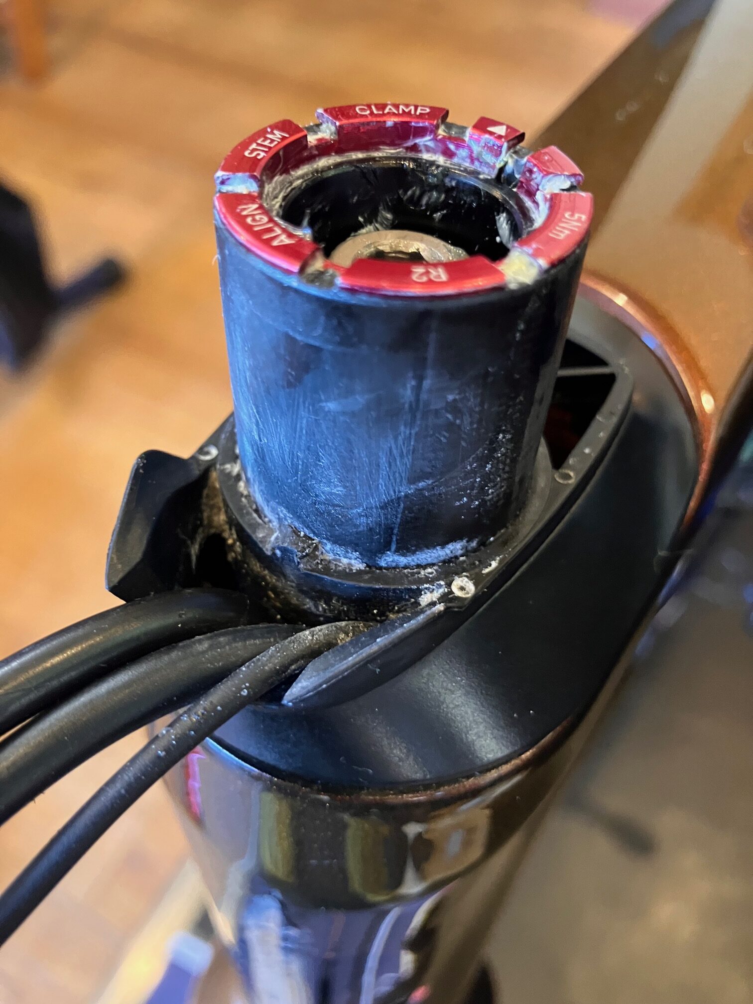 ロードバイクのステアリングが重いとのことで、ヘッドパーツ上下のベアリングの交換です。
