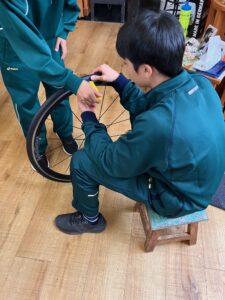 その後、今日はスポーツバイクのあれこれを体験してもらうべく、店内商品の説明・空気の入れ方・洗車・車輪の外し方・チューブ交換を実施・実践してもらいました。