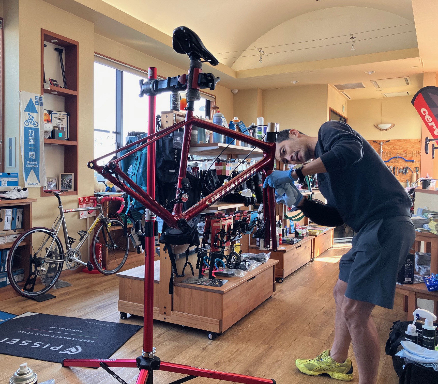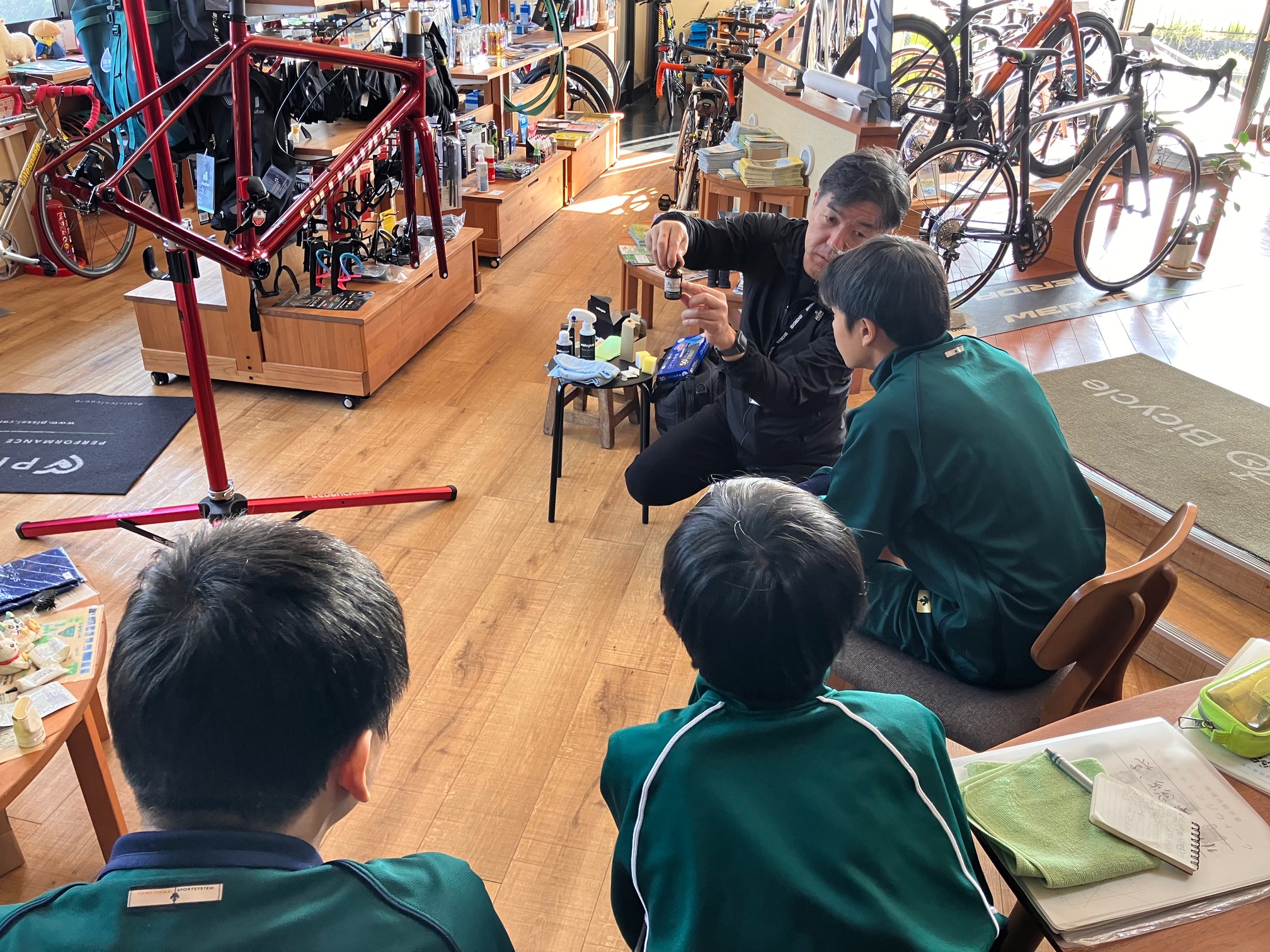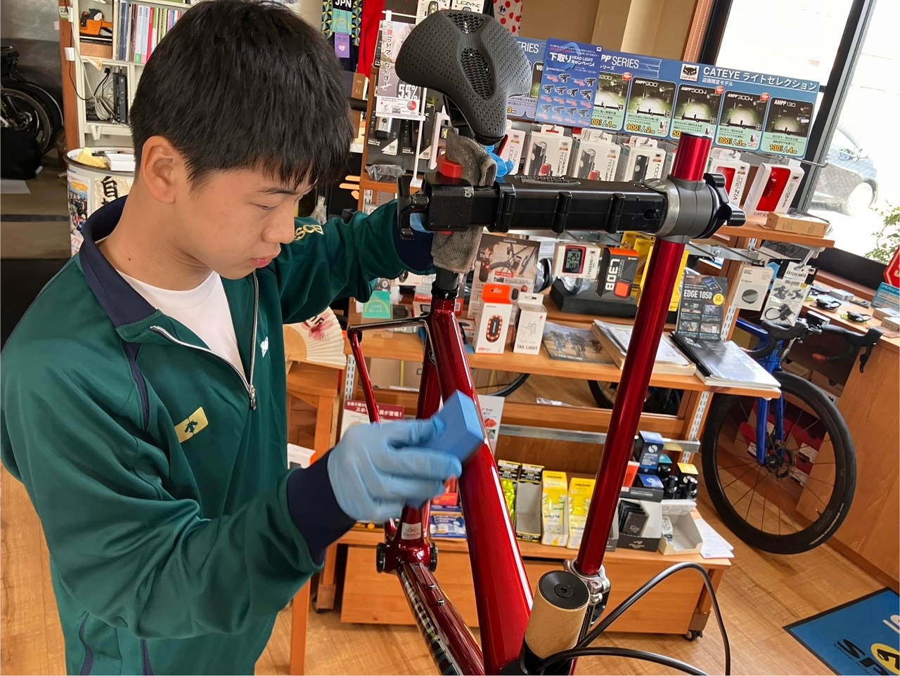 午前中は、ソフト99の方に来ていただき、自転車に施すコーティングについて実践を交えた講習会を受講しました。